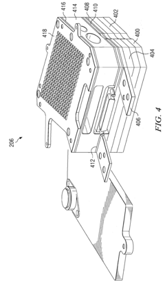 Technical Solution: Raytheon has developed advanced liquid cooling solutions specifically for phased array radar systems that address thermal management challenges in high-power density applications. Their approach integrates microchannels directly into the transmit/receive modules, allowing coolant to flow in close proximity to heat-generating components. This design achieves junction temperatures below 125°C even at high power levels, significantly extending operational life. Raytheon's system employs a closed-loop architecture with specialized coolants that maintain thermal stability across wide temperature ranges (-40°C to +85°C). Their latest generation implements predictive thermal management using embedded sensors and machine learning algorithms to anticipate thermal loads and adjust cooling parameters proactively, reducing thermal cycling stress by approximately 30%. The company has also pioneered the use of advanced materials with high thermal conductivity and matched coefficients of thermal expansion to minimize mechanical stress during thermal cycling.