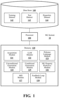 Machine learning models can be trained on polymer representation data to predict various properties such as mechanical strength, thermal stability, and chemical reactivity. These predictive models enable rapid screening of potential polymer candidates without the need for extensive experimental testing. By leveraging historical data and structure-property relationships, these models can identify promising polymer structures for specific applications and guide the development of new materials.Expand Specific Solutions04 Polymer sequence and structure generation