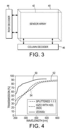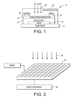 Technical Solution: Semiconductor Energy Laboratory (SEL) has developed advanced oxide semiconductor photodetectors utilizing indium-gallium-zinc oxide (IGZO) thin-film technology. Their approach incorporates a unique multi-layer structure with optimized oxygen vacancy concentration to enhance UV and visible light detection sensitivity. SEL's photodetectors feature a bottom-gate thin-film transistor architecture with amorphous IGZO as the active layer, enabling high electron mobility (>10 cm²/Vs) while maintaining transparency in the visible spectrum[1]. The company has pioneered the integration of these photodetectors with readout circuitry on the same substrate, creating monolithic image sensors with high fill factors exceeding 70%. Their recent innovations include implementing bandgap engineering through compositional tuning of the oxide semiconductor layers to achieve wavelength selectivity between UV and visible regions[3], and developing self-powered photodetector arrays that generate photocurrent without external bias voltage.