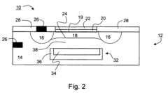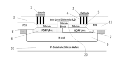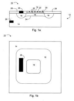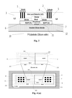 Technical Solution: ams-OSRAM has developed sophisticated semiconductor technologies that exploit the different breakdown behaviors of P-N junctions and Zener diodes for sensing and protection applications. Their approach incorporates precisely engineered doping profiles that enable controlled Zener breakdown through both avalanche multiplication and tunneling mechanisms. The company's proprietary "TrenchZener" technology utilizes vertical structures with optimized electric field distribution, achieving breakdown voltage tolerances below ±2% across production batches[5]. For applications requiring temperature stability, ams-OSRAM has developed complementary breakdown structures that combine positive and negative temperature coefficient elements to create near-zero temperature coefficient reference voltages. Their sensing solutions leverage the sharp noise characteristics that differentiate Zener breakdown from conventional P-N junction breakdown, enabling high-precision threshold detection in noisy environments. The company has also pioneered integrated solutions that combine sensing and protection functions by utilizing different breakdown mechanisms within a single device structure, allowing for compact designs in space-constrained applications like wearable electronics and IoT devices.