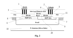 Advanced semiconductor fabrication techniques have enabled novel P-N junction structures with enhanced breakdown performance. These include super-junction designs, buried breakdown regions, and engineered electric field distributions that optimize the trade-off between breakdown voltage and on-resistance. Some designs incorporate multiple junctions or specialized doping profiles to achieve more precise breakdown voltages or to improve reliability under surge conditions. These innovations have led to Zener diodes with sharper breakdown characteristics, lower leakage currents, and improved power handling capabilities.Expand Specific Solutions