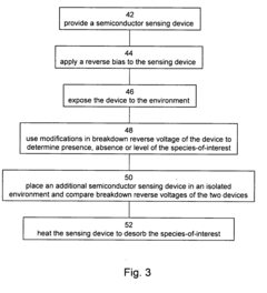 - A molecular controlled semiconductor sensing device is developed, featuring a device body with at least two semiconductor regions forming a p-n junction, where charge carrier concentrations are selected to achieve a predetermined reverse breakdown voltage, and molecules are deposited on the semiconductor material to interact with species-of-interest, modifying the breakdown voltage for sensitive and selective sensing.