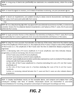 - A wearable device that determines the relative ratios of P-wave and R-wave features over time, such as P-wave area to R-wave amplitude, P-wave duration to R-wave amplitude, and P-wave amplitude to R-wave amplitude, allowing for early detection and surveillance of cardiac amyloidosis without requiring absolute R-wave measurements, using a microprocessor to record and compare these ratios.