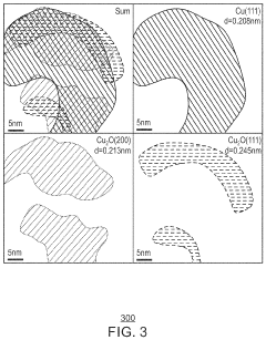 Technical Solution: Dalian Institute of Chemical Physics (DICP) has developed advanced electrocatalysts for CO2 valorization focusing on copper-based materials with precisely controlled morphology and electronic structure. Their approach involves synthesizing Cu nanoparticles with specific facets and grain boundaries to enhance C-C coupling for higher-value products. DICP has pioneered the use of in-situ characterization techniques to monitor catalyst surface changes during CO2 reduction, allowing for real-time optimization of reaction parameters. Their research has established optimal operating conditions: near-neutral pH (6.8-7.2), moderate temperatures (25-40°C), and potential ranges of -0.7 to -1.1V vs. RHE for maximizing C2+ product selectivity. DICP has also developed novel flow-cell reactor designs that achieve current densities exceeding 300 mA/cm² while maintaining over 60% Faradaic efficiency for ethylene and ethanol production[1][2]. Their catalyst systems incorporate bimetallic structures and nitrogen-doped carbon supports to stabilize Cu+ species, which have been identified as critical active sites for efficient CO2 conversion.