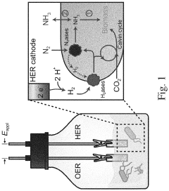 Biomimetic approaches to ammonia synthesis inspired by natural nitrogen fixation processes. These technologies utilize either engineered microorganisms, isolated enzymes (particularly nitrogenase), or synthetic analogs that can convert atmospheric nitrogen to ammonia under mild conditions. The biological systems operate at ambient temperature and pressure, potentially offering significant energy savings compared to conventional chemical processes.Expand Specific Solutions04 Plasma-Assisted Ammonia Synthesis
