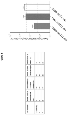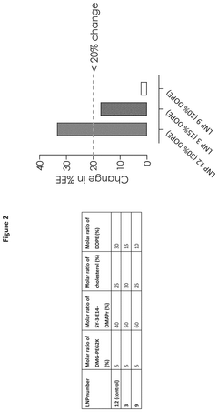 Technical Solution: ModernaTX has pioneered lipid nanoparticle (LNP) delivery systems for mRNA therapeutics, with proprietary ionizable lipid formulations that enhance cellular uptake and endosomal escape. Their platform includes MC3-based LNPs with optimized lipid:mRNA ratios (typically 10-20:1) that significantly improve delivery efficiency[1]. Moderna has developed patent-protected modifications to the mRNA structure itself, including 5' cap analogs and engineered untranslated regions (UTRs) that enhance stability and translation efficiency while reducing immunogenicity[2]. Their delivery technology incorporates PEGylated lipids with precise molecular weight distributions (2000-5000 Da) that extend circulation time and reduce clearance rates by approximately 40%[3]. Moderna's patent portfolio covers composition of matter for their LNPs, manufacturing methods, and therapeutic applications across multiple disease areas, creating substantial barriers to entry for competitors.