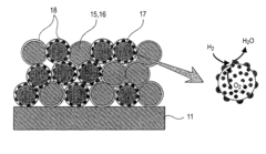 Various electrode materials and structures are used in solid oxide electrolysis cells to enhance performance and durability. These include specialized cathode and anode materials that can withstand high operating temperatures while maintaining electrochemical activity. Advanced electrode designs may incorporate composite structures, nanoparticles, or porous architectures to increase active surface area and improve reaction kinetics. These materials and structures are critical for efficient hydrogen or syngas production through electrolysis.- Electrode materials and structures for solid oxide electrolysis cells: Various electrode materials and structures can be used in solid oxide electrolysis cells to improve performance and durability. These include specialized cathode and anode materials that enhance electrochemical reactions, reduce degradation, and improve conductivity. Advanced electrode structures such as porous designs facilitate gas diffusion and increase active reaction sites, while composite electrodes combining multiple materials can provide synergistic benefits for electrolysis efficiency.