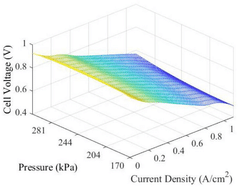 - By establishing the battery voltage and current density polarization curves, using the interpolation method to convert into a three-dimensional curve, combined with the particle swarm optimization algorithm, the system efficiency is calculated and the working pressure is optimized to obtain the optimal working pressure under different current densities.