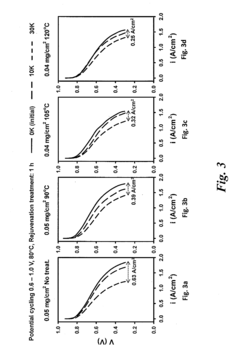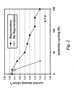 - A rejuvenation process involving dehydration of the fuel cell followed by exposure to a dry gas at elevated temperatures to mitigate current density deterioration, effectively reversing performance loss and maintaining high performance levels.