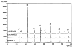 - Modified perovskite catalysts with enhanced performance: Perovskite catalysts can be modified through doping, surface decoration, and composite formation to enhance their catalytic performance. Incorporation of noble metals, rare earth elements, or transition metals into the perovskite structure can significantly improve activity and selectivity. Additionally, creating perovskite-based composites with other materials such as carbon supports or metal oxides can provide synergistic effects and improved stability under reaction conditions.