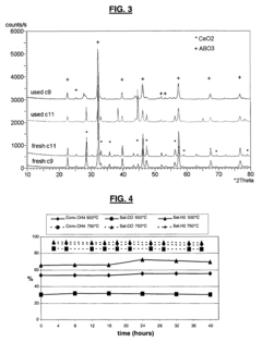 - Perovskite catalysts for hydrocarbon processing: Perovskite-structured materials function as catalysts in various hydrocarbon processing applications, including reforming, cracking, and oxidative coupling of methane. These catalysts demonstrate selectivity and activity in converting hydrocarbons to value-added products. The redox properties of perovskites, particularly those containing transition metals in the B-site, make them effective for partial oxidation reactions and hydrocarbon transformation processes.