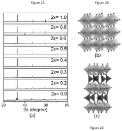 Perovskite materials are employed as catalysts in various energy conversion and storage applications, including fuel cells, water splitting for hydrogen production, and CO2 conversion. These catalysts demonstrate promising activity for oxygen reduction and evolution reactions, serving as alternatives to precious metal catalysts. Their versatility in energy applications stems from their mixed ionic-electronic conductivity, oxygen vacancy formation capability, and tunable redox properties.Expand Specific Solutions05 Modified perovskite catalysts with enhanced performance