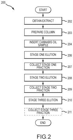 - A liquid chromatography system is employed to extract specific compounds from raw cannabis oil, using a method that involves a packed column with a stationary phase, multiple eluents, and fractionation to achieve THC levels below 0.3% while maintaining the cannabinoid profile, including CBD, CBC, CBG, and terpenes.