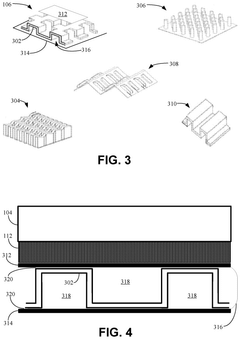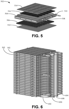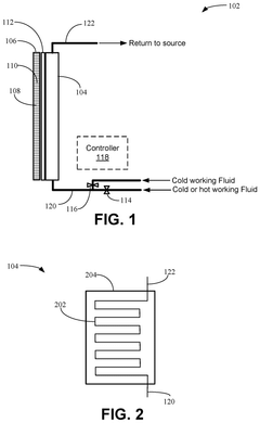 Technical Solution: DENSO has pioneered phase-change-assisted heat exchanger technology specifically for automotive thermal management systems. Their design incorporates a dual-phase heat exchange mechanism that utilizes both latent and sensible heat transfer to maximize thermal efficiency. DENSO's heat exchangers feature precision-engineered microchannels with optimized geometries that enhance phase change dynamics while minimizing pressure drops. The company has developed specialized surface treatments that promote nucleate boiling and condensation, significantly improving heat transfer coefficients during phase transitions. Their systems incorporate intelligent flow distribution manifolds that ensure uniform refrigerant distribution across multiple parallel channels, preventing flow maldistribution that can reduce efficiency. DENSO has also integrated advanced phase change materials (PCMs) within their heat exchanger designs to provide thermal buffering capabilities during transient operating conditions.