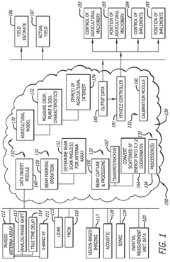 - A phased antenna array radar system is used to collect data, which can be combined with other sensors like cameras, Lidar, and acoustic sensors, employing beamforming techniques for precise signal control and penetration through vegetation, enabling detailed observations of soil structure and vegetation, and improving yield estimations.