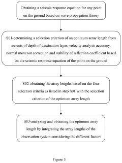 - A method based on wavefield propagation theory is proposed, which involves obtaining a seismic response equation, determining selection criteria for array length considering factors like depth, velocity analysis, normal moveout correction, and amplitude variations, and integrating these to determine the optimum array length as √{square root over (2)} times the depth of the destination layer.