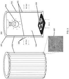 - Visible light-activated photocatalytic disinfection: Recent advancements have focused on developing photocatalysts that can be activated by visible light rather than just UV radiation. This innovation significantly expands the practical applications of photocatalytic disinfection by enabling the use of natural sunlight or common indoor lighting. Techniques include doping conventional photocatalysts with metals or non-metals, creating composite materials, or developing entirely new photocatalytic compounds that respond to the visible light spectrum.