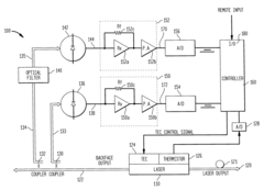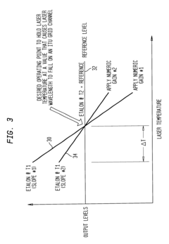 - A closed-loop feedback control system with a temperature-tuned, wavelength-stabilized laser module that monitors etalon signal slopes and calculates a new numeric gain to adjust the control signal, preventing oscillations and maintaining wavelength stability by using a controller with filtering and reference circuitry to input etalon and reference signals, and adjust the laser temperature accordingly.