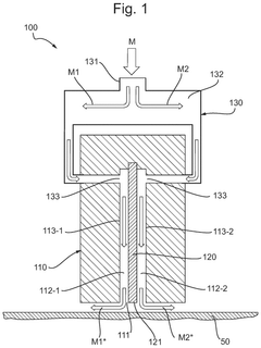Technical Solution: Applied Materials has developed advanced plasma source designs for Spatial Atomic Layer Deposition (SALD) systems that utilize a multi-zone plasma configuration. Their technology incorporates radio frequency (RF) powered electrodes with independent power control for each plasma zone, enabling precise plasma density distribution across the deposition area. The system employs a unique gas distribution design that separates precursor and plasma regions while maintaining laminar flow conditions, critical for SALD processes. Applied Materials' plasma sources feature impedance matching networks that automatically adjust to changing process conditions, ensuring plasma stability during continuous operation. Their designs also incorporate advanced thermal management systems that prevent overheating of plasma components while maintaining substrate temperature uniformity within ±1°C, essential for high-quality film deposition in high-throughput SALD applications.