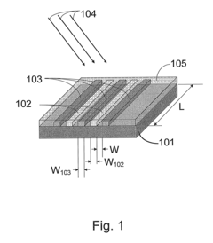Combining plasmonic biosensors with microfluidic platforms creates integrated lab-on-chip devices that enable precise sample handling, reduced reagent consumption, and multiplexed detection capabilities. These integrated systems facilitate automated sample processing and analysis, making them suitable for high-throughput screening applications. The microfluidic channels direct analytes to specific sensing regions, improving detection efficiency and enabling parallel analysis of multiple biomarkers.Expand Specific Solutions04 Waveguide-coupled plasmonic biosensors