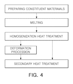 Technical Solution: Daido Steel has developed an innovative precipitation hardening approach for high-entropy alloys specifically targeting high-temperature applications in aerospace and power generation. Their technology focuses on refractory element-containing HEAs (Re-HEAs) with carefully controlled additions of Al, Ti, and Nb to promote formation of ordered L12 and B2 precipitates. Daido's process involves vacuum induction melting followed by directional solidification to control grain structure, then a proprietary three-stage heat treatment: solution treatment (1200-1300°C), primary aging (900-950°C), and secondary aging (700-750°C). This creates a hierarchical precipitate structure with primary strengthening phases (50-100nm) surrounded by nanoscale secondary precipitates (5-15nm). Their advanced Re-HEAs demonstrate exceptional creep resistance at temperatures up to 1100°C, with creep rates 40-60% lower than conventional nickel superalloys. Daido has successfully implemented these materials in experimental turbine components, demonstrating service life improvements of 30-40% under extreme thermal conditions.