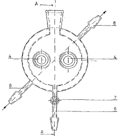 - A horizontal electrochemical cell with a double cylindrical glass container arrangement, featuring coaxial inner and outer bodies, perpendicular lid, and strategically placed tubular penetrations for electrodes, gas bubbler, sensors, and a stop valve, allowing for optical image acquisition and real-time process interpretation.