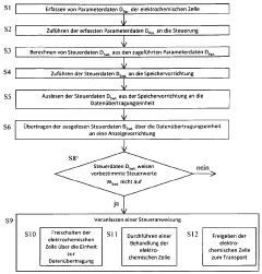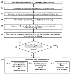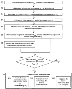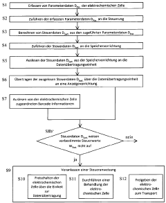 Technical Solution: BYD has developed an integrated control and monitoring system for electrochemical iron cells that leverages their extensive experience in battery manufacturing. Their solution employs a hierarchical control architecture with three distinct layers: cell-level monitoring, module-level control, and system-level optimization. At the cell level, BYD utilizes proprietary sensors that continuously measure electrolyte conductivity, temperature distribution, and electrode potential with high precision. These sensors are designed to withstand the corrosive environment of iron cells while maintaining measurement accuracy. The module-level control system implements advanced algorithms that dynamically adjust current density and electrolyte flow rates to maintain optimal operating conditions across multiple cells. BYD's system incorporates real-time impedance spectroscopy techniques that can detect early signs of electrode degradation or electrolyte imbalance before they affect production quality. Their cloud-based analytics platform aggregates historical performance data to identify long-term trends and optimize process parameters, resulting in reported energy efficiency improvements of up to 15% compared to conventional control methods.