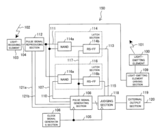 Technical Solution: OMRON has developed a comprehensive approach to light interference resilience in their sensing technologies. Their B5W Light Convergent Reflective Sensor series utilizes a unique optical design with specialized convergent lens technology that focuses emitted light to a precise detection point, significantly reducing the impact of ambient light interference. The sensors incorporate proprietary I-CT (Interference-Cancellation Technology) that employs dual-wavelength sensing with synchronized detection to effectively eliminate environmental light noise. OMRON's proximity sensors feature advanced signal conditioning circuits with programmable threshold adjustments that can be calibrated for specific operating environments. Additionally, they've implemented pulsed modulation techniques with frequency discrimination to distinguish between the sensor's emitted signal and ambient light sources. Their latest generation sensors also incorporate temperature compensation mechanisms to maintain consistent performance across varying environmental conditions, addressing thermal drift issues that can affect detection reliability in challenging lighting scenarios[5][7].