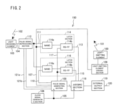 - The optical modulation-type detection device employs a pulse signal converting section that cuts off the light-reception signal pathway to suppress offset, allowing for accurate offset canceling under external disturbance light conditions, and operates in specific modes to detect the presence or absence of an object with high sensitivity without increasing circuit size or bias current.