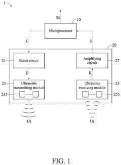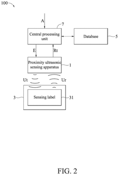 Technical Solution: Bosch has developed comprehensive sensor fusion systems that integrate both proximity and ultrasonic sensors for automotive applications. Their proximity sensors utilize capacitive, infrared, and electromagnetic technologies with detection ranges of 0.2-5m and response times under 10ms. Their ultrasonic sensors operate at frequencies between 40-50kHz with ranges up to 8m. Field tests demonstrate that Bosch's proximity sensors excel in close-range detection (0-1m) with 98% accuracy in varying lighting conditions, while their ultrasonic sensors maintain 95% accuracy at distances of 1-5m even in adverse weather. Bosch's dual-technology approach allows for redundancy and enhanced reliability, with their latest generation showing a 30% reduction in false positives compared to single-sensor systems.