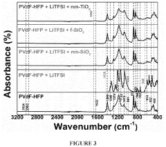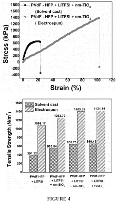 - Development of electrospun composite polymer electrolyte separators using poly(vinylidene fluoride-co-hexafluoro propylene) (PVdF-HFP) with bis(trifluoromethane)sulfonimide lithium salt and nanoparticle fillers like SiO2, TiO2, and fumed SiO2, which form high ionic conductivity, mechanically robust membranes that prevent polysulfide dissolution.