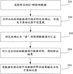 GC-MS quantification methods have been developed for specific applications across various fields including environmental analysis, food safety, pharmaceutical testing, forensic science, and metabolomics. These methods are tailored to address the unique challenges associated with each application, such as complex matrices, trace-level detection requirements, or the need for multi-component analysis. Application-specific methods often involve specialized sample preparation, chromatographic conditions, and detection parameters optimized for particular analytes.Expand Specific Solutions05 Data processing and analysis for GC-MS quantification