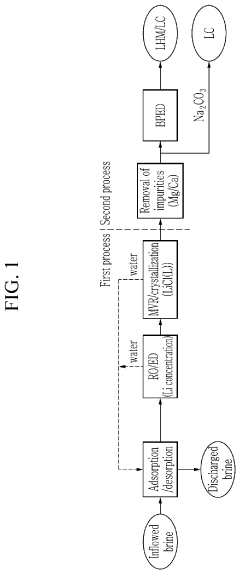 Advanced direct lithium extraction (DLE) technologies have been developed to minimize water consumption compared to traditional evaporation methods. These technologies utilize selective adsorption materials, ion exchange resins, or membranes that can extract lithium from brines while returning most of the water back to the source. This approach significantly reduces the water footprint of lithium production, making it more environmentally sustainable, especially in water-scarce regions.- Water-efficient direct lithium extraction technologies: Advanced direct lithium extraction (DLE) technologies focus on minimizing water consumption through closed-loop systems and water recycling processes. These methods significantly reduce freshwater requirements compared to traditional evaporation ponds by implementing water recovery systems that capture and reuse process water. The technologies include specialized membranes and filtration systems designed specifically to maximize water efficiency while maintaining effective lithium recovery rates.