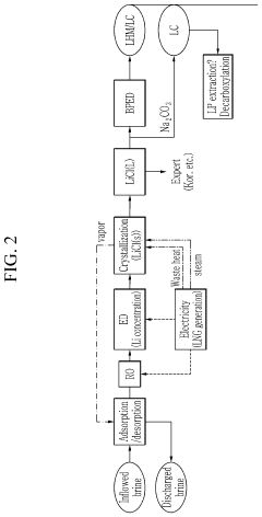 Technical Solution: Koch Technology Solutions has developed advanced membrane-based separation technologies for Direct Lithium Extraction that focus on water conservation and reuse. Their system employs specialized nanofiltration and reverse osmosis membranes that enable selective lithium recovery while minimizing water consumption. The company has implemented comprehensive water accounting methodologies that track water usage across the entire extraction process, from initial brine processing to lithium concentration and purification. Their technology incorporates a multi-stage water recovery system that captures and treats process water for reuse, achieving water recycling rates exceeding 85%. Koch's approach includes sophisticated sensors and flow meters that provide continuous data on water volumes and quality at each process stage, enabling precise quantification of net water consumption. The company has also developed predictive modeling tools that optimize water usage based on brine chemistry and desired lithium output specifications.