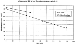 - An aqueous nitrate-containing solution with a pH of less than 5.0 is treated under electromagnetic irradiation with a suitable reducing agent, allowing for the direct reduction of nitrate to nitrogen at room temperature, combining photochemical and chemical reduction processes.