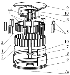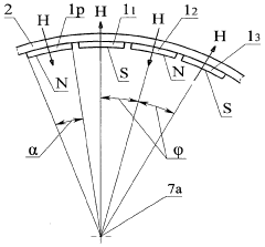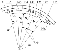 - The design features a radial working gap with magnetic poles connected by a magnetic circuit, where the electromagnet winding is placed between pole parts, allowing for a longer winding segment between central and side pole parts, optimizing magnetic flux and reducing heat losses by adjusting the angular dimensions and distances between pole surfaces.