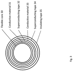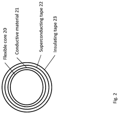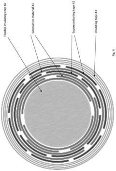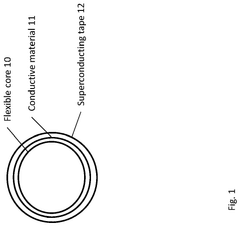 - A cable construction method involving a flexible core with a conductive layer that provides mechanical cushioning and electrical stabilization by wrapping superconducting tape helically around it, with controlled tension and surface quality to minimize stress and strain, and incorporating intermediate conductive layers between superconducting layers to prevent degradation.
