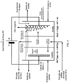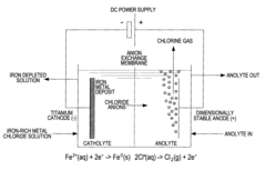 Electrochemical iron processes generate various metal oxide byproducts that can be recovered and valorized. These include iron oxides, mixed metal oxides, and other metallic compounds that precipitate during processing. Recovery methods include filtration, precipitation, and separation techniques. The recovered oxides can be repurposed as pigments, catalysts, magnetic materials, or feedstock for other metallurgical processes. This approach not only reduces waste disposal costs but creates additional revenue streams from what would otherwise be considered waste material.Expand Specific Solutions03 Electrolyte regeneration and valuable element extraction