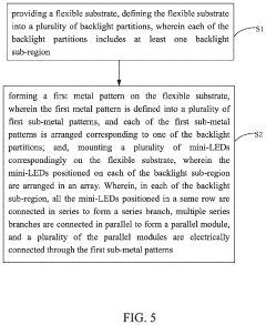 - A mini-LED backlight module design featuring a flexible substrate with backlight partitions and metal patterns, where mini-LEDs are arranged in series and parallel branches, connected through sub-metal patterns to reduce driving voltage and current, and improve brightness uniformity by independent signal input to each sub-region.