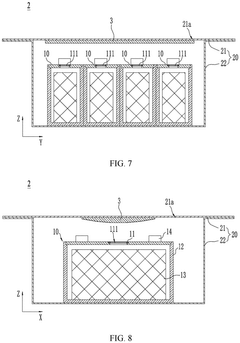 Fire suppression and containment technologies are designed to limit the spread and impact of thermal runaway events. These include specialized materials for battery enclosures, fire-resistant barriers, and active suppression systems that can deploy fire-extinguishing agents. Regulatory standards increasingly require these protective measures to be incorporated into battery systems, particularly for applications in sensitive environments such as transportation, energy storage, and consumer electronics.Expand Specific Solutions05 Battery design and material innovations for safety