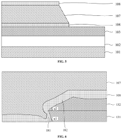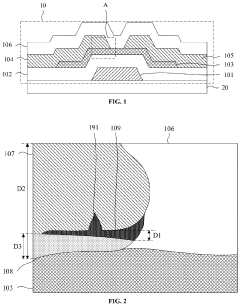 Various fabrication techniques are employed to manufacture metal oxide TFTs, including sputtering, atomic layer deposition (ALD), solution processing, and chemical vapor deposition (CVD). These methods control the deposition of metal oxide layers with precise thickness and composition, which directly affects transistor performance. Post-deposition treatments such as annealing are often used to improve crystallinity and electrical properties of the metal oxide semiconductor layer.Expand Specific Solutions03 Device structures and architectures for metal oxide TFTs
