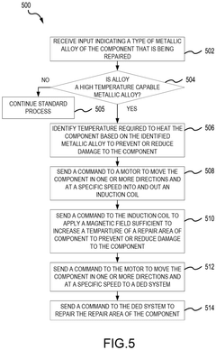 Directed Energy Deposition repair processes require rigorous quality control and testing protocols to ensure the integrity of repaired components. These protocols include non-destructive testing methods, microstructural analysis, and mechanical property verification to validate the repair quality. The qualification process involves standardized testing procedures to assess the bond strength between the deposited material and substrate, as well as the overall structural integrity of the repaired component.- Quality control and testing protocols for DED repairs: Directed Energy Deposition repair processes require rigorous quality control and testing protocols to ensure the repaired components meet industry standards. These protocols include non-destructive testing methods, microstructural analysis, and mechanical property verification. The qualification process typically involves testing the repaired area for defects, evaluating the bond strength between the deposited material and substrate, and confirming that the repaired component maintains its original performance characteristics.