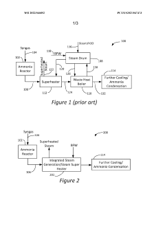 - Heat management systems in ammonia production: Innovative heat management systems designed specifically for ammonia synthesis processes to control reaction thermodynamics. These systems include heat exchangers, thermal integration techniques, and waste heat recovery mechanisms that optimize energy utilization throughout the production process. Effective thermal management helps maintain ideal reaction conditions while minimizing energy losses, contributing to more efficient and environmentally friendly ammonia production.