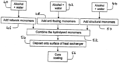 - A siloxane-based coating with silicon, oxygen, and fluorinated alkyl groups forms a continuous, inert, and self-regenerating layer on heat exchanger surfaces, reducing fouling through low surface energy and even fluorination distribution, allowing chemical bonding without mechanical substrate preparation, and maintaining anti-fouling properties even when worn.