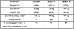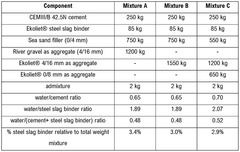 - A cement-free concrete composition comprising at least 55% steel slag aggregate, 15-40% ground steel slag binder, up to 1.0% chelating agent, and controlled water content, with specific particle size distribution, to enhance heat resistance and prevent cracking up to 450°C.