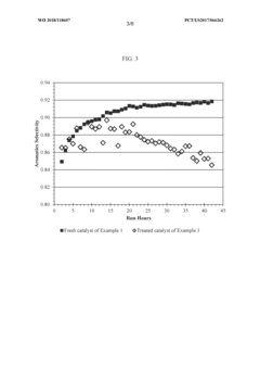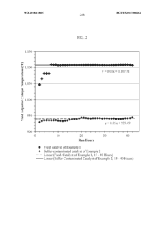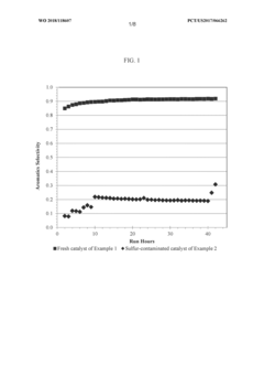Technical Solution: China Petroleum & Chemical Corp. (Sinopec) has developed comprehensive catalyst regeneration technologies focusing on organics and sulfur poisoning. Their approach includes a multi-stage thermal regeneration process that systematically removes carbon deposits at controlled temperatures (400-550°C) while maintaining catalyst structural integrity. For sulfur poisoning, they employ proprietary chemical washing techniques using alkaline solutions followed by controlled oxidation to convert sulfur compounds to removable forms. Their research has demonstrated that optimized regeneration can restore up to 95% of original catalyst activity in petroleum refining applications. Sinopec has also pioneered in-situ regeneration methods that reduce downtime by allowing partial regeneration during operation. Their latest innovation involves using supercritical CO2 as an environmentally friendly solvent for removing organic poisons from catalyst surfaces without thermal damage.