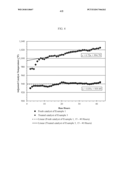 Novel catalyst formulations have been developed with enhanced resistance to poisoning. These include catalysts with modified surface properties, protective coatings, or additives that preferentially bind to poisons. Some formulations incorporate sacrificial components that selectively attract poisons away from active sites. These approaches aim to extend catalyst lifetime and reduce the frequency of regeneration cycles, improving process economics and sustainability.Expand Specific Solutions