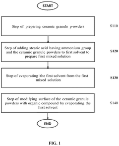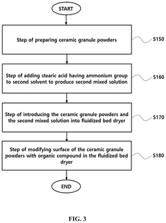 - A ceramic thermal spray coating material is developed with a surface-modified ceramic granule powder using stearic acid with an ammonium group, applied through methods like spray drying or fluidized bed drying, to enhance fluidity and minimize residue.