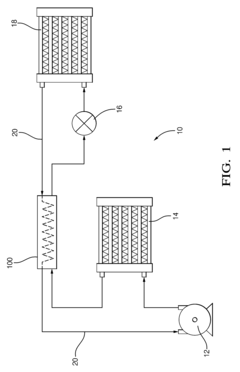 Implementing novel cooling media and phase-change techniques can dramatically improve the cooling efficiency of compact double-pipe heat exchangers. Using nanofluids, which contain suspended nanoparticles, can enhance thermal conductivity compared to conventional coolants. Phase-change materials or refrigerants that undergo phase transitions during the heat exchange process can take advantage of latent heat, significantly increasing the heat transfer capacity without increasing the exchanger size. These advanced cooling approaches allow compact exchangers to handle higher heat loads.Expand Specific Solutions05 Modular and stackable compact heat exchanger systems