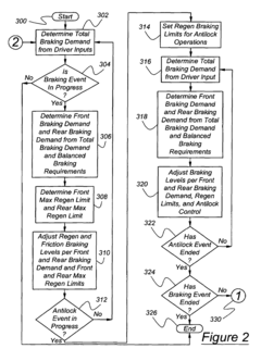 - A method and system that determine brake demand and regenerative braking availability for each axle, utilizing surplus regenerative braking from one axle to support another and applying friction braking when necessary to ensure maximum regenerative braking capability while minimizing anti-lock braking mode operation.